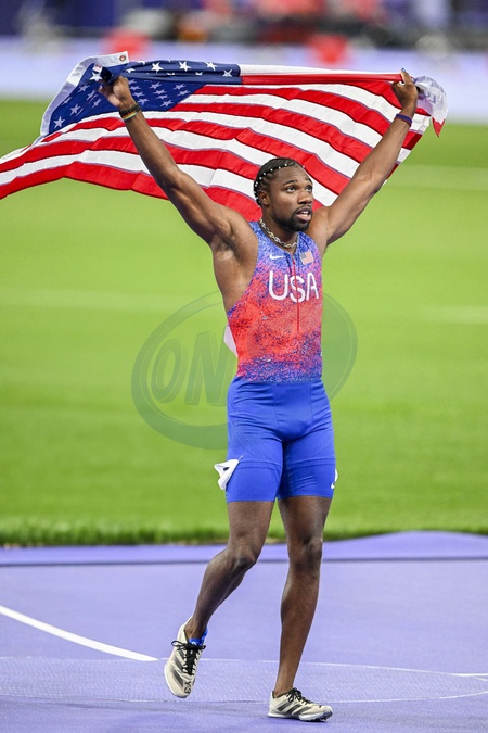 Noah Lyles - Célébrités assistent à la finale homme du 100m au Stade de France lors des Jeux Olympiques de Paris2024 (JO) le 4 aout 2024. © Perusseau-Jacovides/Bestimage Celebrities attend the men's 100m final at Stade de France during the Paris2024 Olympic Games (Olympics) on August 4, 2024.