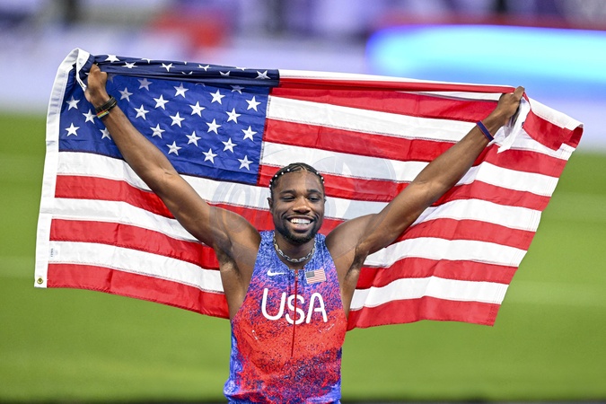 Noah Lyles - Célébrités assistent à la finale homme du 100m au Stade de France lors des Jeux Olympiques de Paris2024 (JO) le 4 aout 2024. © Perusseau-Jacovides/Bestimage Celebrities attend the men's 100m final at Stade de France during the Paris2024 Olympic Games (Olympics) on August 4, 2024.