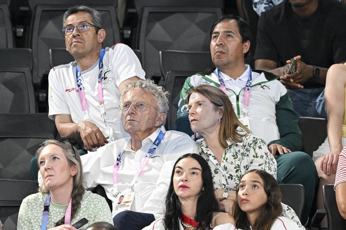 Nelson Monfort et sa femme Dominique - Les célébrités assistent aux épreuves de gymnastique lors des Jeux Olympiques de Paris2024 (JO), le 5 août 2024. © Jacovides-Perusseau / Bestimage Celebrities attend the gymnastics events during the Paris 2024 Summer Olympics (Olympic Games) on August 5, 2024.