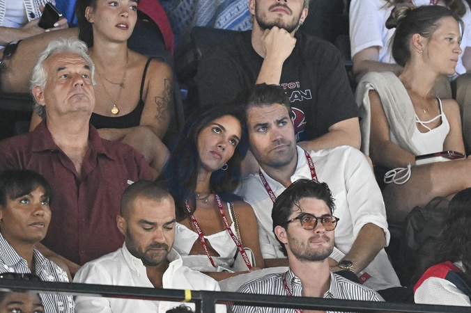 Jesse Williams, Chase Stokes, Paul Wesley et sa compagne Natalie Kuckenburg - Les célébrités assistent aux épreuves de gymnastique lors des Jeux Olympiques de Paris2024 (JO), le 5 août 2024. © Jacovides-Perusseau / Bestimage Celebrities attend the gymnastics events during the Paris 2024 Summer Olympics (Olympic Games) on August 5, 2024.