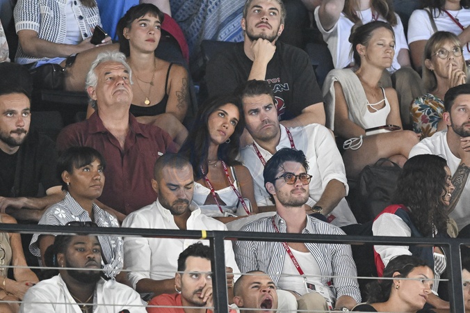 Jesse Williams, Chase Stokes, Paul Wesley et sa compagne Natalie Kuckenburg - Les célébrités assistent aux épreuves de gymnastique lors des Jeux Olympiques de Paris2024 (JO), le 5 août 2024. © Jacovides-Perusseau / Bestimage Celebrities attend the gymnastics events during the Paris 2024 Summer Olympics (Olympic Games) on August 5, 2024.