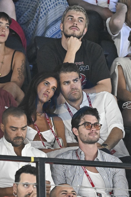 Jesse Williams, Chase Stokes, Paul Wesley et sa compagne Natalie Kuckenburg - Les célébrités assistent aux épreuves de gymnastique lors des Jeux Olympiques de Paris2024 (JO), le 5 août 2024. © Jacovides-Perusseau / Bestimage Celebrities attend the gymnastics events during the Paris 2024 Summer Olympics (Olympic Games) on August 5, 2024.