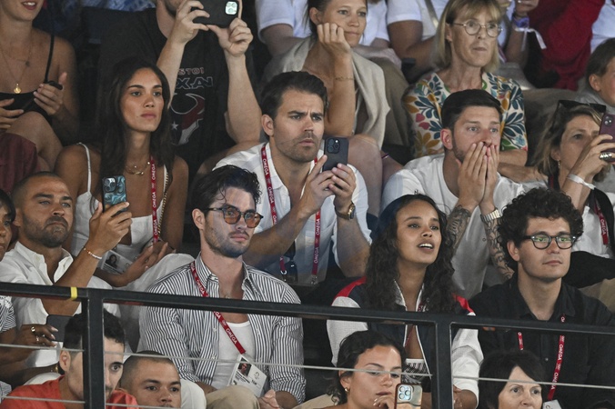 Jesse Williams, Chase Stokes, Paul Wesley et sa compagne Natalie Kuckenburg - Les célébrités assistent aux épreuves de gymnastique lors des Jeux Olympiques de Paris2024 (JO), le 5 août 2024. © Jacovides-Perusseau / Bestimage Celebrities attend the gymnastics events during the Paris 2024 Summer Olympics (Olympic Games) on August 5, 2024.