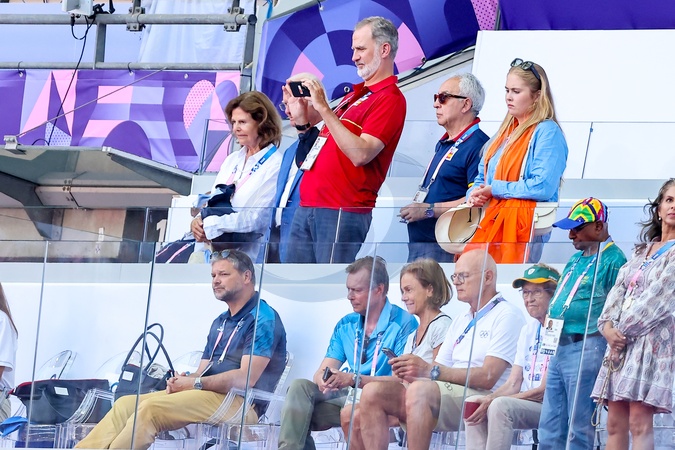 Król Karol XVI Gustaw, królowa Sylwia, król Felipe VI, księżniczka Catharina-Amalia i wielki książę Henryk Luksemburga biorą udział w zawodach lekkoatletycznych podczas Igrzysk Olimpijskich w Paryżu w 2024 r. (OG) na Stade France