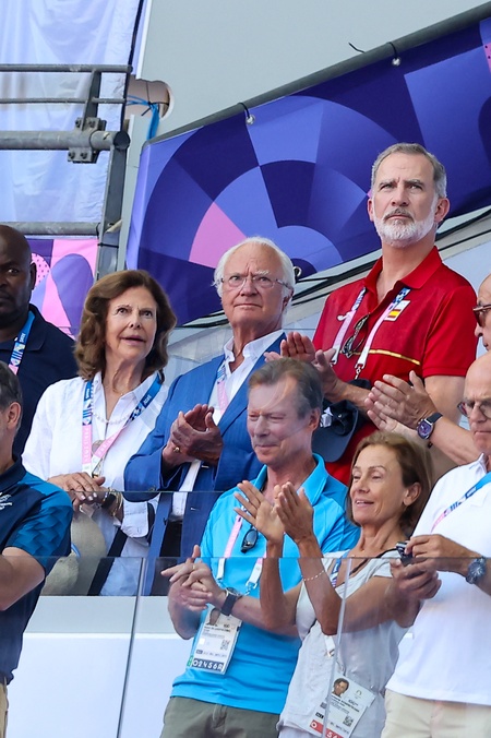 Król Karol XVI Gustaw, królowa Sylwia, król Felipe VI, księżniczka Catharina-Amalia i wielki książę Henryk Luksemburga biorą udział w zawodach lekkoatletycznych podczas Igrzysk Olimpijskich w Paryżu w 2024 r. (OG) na Stade France