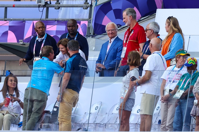 Król Karol XVI Gustaw, królowa Sylwia, król Felipe VI, księżniczka Catharina-Amalia i wielki książę Henryk Luksemburga biorą udział w zawodach lekkoatletycznych podczas Igrzysk Olimpijskich w Paryżu w 2024 r. (OG) na Stade France