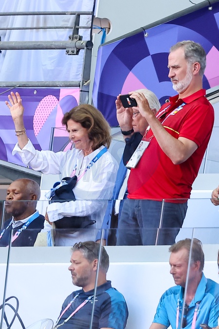 Król Karol XVI Gustaw, królowa Sylwia, król Felipe VI, księżniczka Catharina-Amalia i wielki książę Henryk Luksemburga biorą udział w zawodach lekkoatletycznych podczas Igrzysk Olimpijskich w Paryżu w 2024 r. (OG) na Stade France