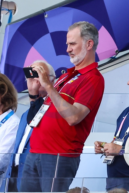 Le roi Felipe VI d'Espagne assiste aux épreuves d'athlétisme lors des Jeux Olympiques de Paris 2024 (JO) au Stade France, à Saint-Denis, France, le 5 août 2024. © Jacovides-Perusseau/bestimage King Felipe VI attends the athletics events during the Paris 2024 Olympic Games (Olympics) at Stade France, in Saint-Denis, France, on August 5, 2024.