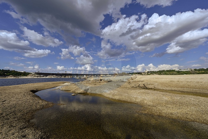 ZAPORIZHZHIA, UKRAINE - JULY 31, 2024 - Clouds are reflected in the puddle as the water level dropped in the Dnipro River after Russian invaders set off the Kakhovka Dam on 6 June 2023, Zaporizhzhia, southeastern Ukraine., Credit:Dmytro Smolienko / Avalon
