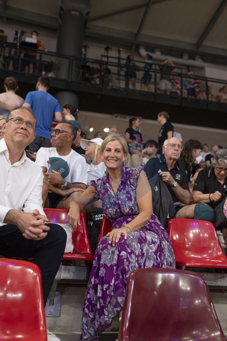 Księżna Sophie z Edynburga patrzy, jak Brytyjki wygrywają finał sprintu drużynowego kobiet w kolarstwie lekkoatletycznym podczas Igrzysk Olimpijskich 2024 w Paryżu (OG) na torze Vélodrome National w Saint-Quentin-en-Yvelines