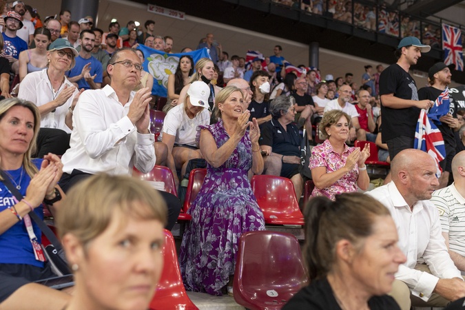 Księżna Sophie z Edynburga patrzy, jak Brytyjki wygrywają finał sprintu drużynowego kobiet w kolarstwie lekkoatletycznym podczas Igrzysk Olimpijskich 2024 w Paryżu (OG) na torze Vélodrome National w Saint-Quentin-en-Yvelines