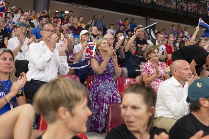 Księżna Sophie z Edynburga patrzy, jak Brytyjki wygrywają finał sprintu drużynowego kobiet w kolarstwie lekkoatletycznym podczas Igrzysk Olimpijskich 2024 w Paryżu (OG) na torze Vélodrome National w Saint-Quentin-en-Yvelines