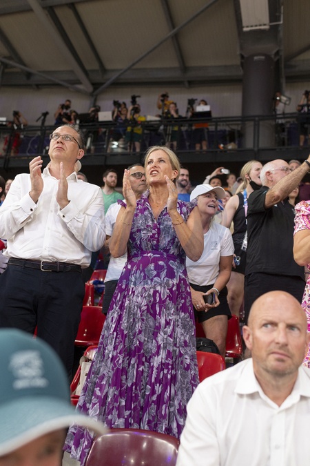 Księżna Sophie z Edynburga patrzy, jak Brytyjki wygrywają finał sprintu drużynowego kobiet w kolarstwie lekkoatletycznym podczas Igrzysk Olimpijskich 2024 w Paryżu (OG) na torze Vélodrome National w Saint-Quentin-en-Yvelines
