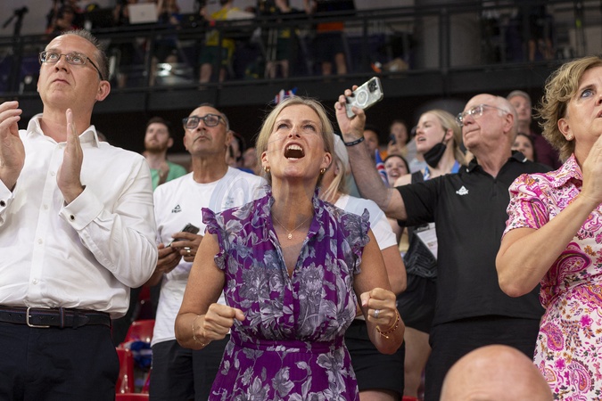 Księżna Sophie z Edynburga patrzy, jak Brytyjki wygrywają finał sprintu drużynowego kobiet w kolarstwie lekkoatletycznym podczas Igrzysk Olimpijskich 2024 w Paryżu (OG) na torze Vélodrome National w Saint-Quentin-en-Yvelines