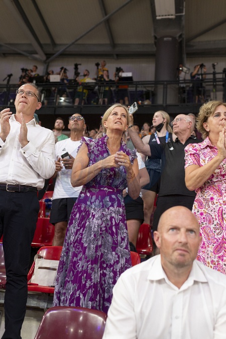 Księżna Sophie z Edynburga patrzy, jak Brytyjki wygrywają finał sprintu drużynowego kobiet w kolarstwie lekkoatletycznym podczas Igrzysk Olimpijskich 2024 w Paryżu (OG) na torze Vélodrome National w Saint-Quentin-en-Yvelines