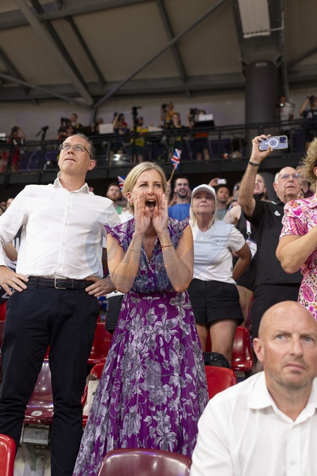 Księżna Sophie z Edynburga patrzy, jak Brytyjki wygrywają finał sprintu drużynowego kobiet w kolarstwie lekkoatletycznym podczas Igrzysk Olimpijskich 2024 w Paryżu (OG) na torze Vélodrome National w Saint-Quentin-en-Yvelines