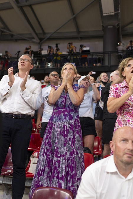 Księżna Sophie z Edynburga patrzy, jak Brytyjki wygrywają finał sprintu drużynowego kobiet w kolarstwie lekkoatletycznym podczas Igrzysk Olimpijskich 2024 w Paryżu (OG) na torze Vélodrome National w Saint-Quentin-en-Yvelines