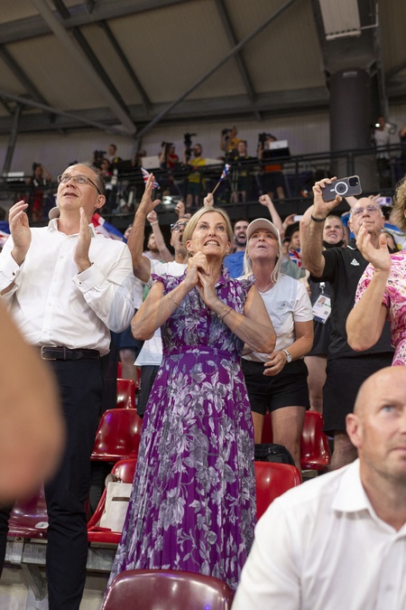 Księżna Sophie z Edynburga patrzy, jak Brytyjki wygrywają finał sprintu drużynowego kobiet w kolarstwie lekkoatletycznym podczas Igrzysk Olimpijskich 2024 w Paryżu (OG) na torze Vélodrome National w Saint-Quentin-en-Yvelines