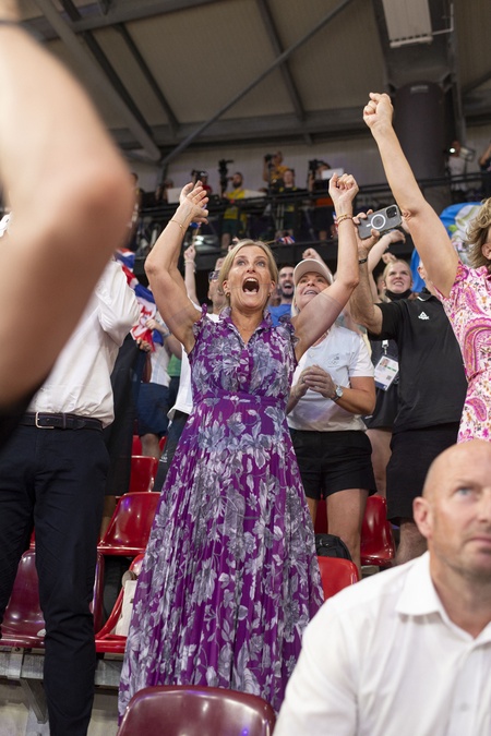 Księżna Sophie z Edynburga patrzy, jak Brytyjki wygrywają finał sprintu drużynowego kobiet w kolarstwie lekkoatletycznym podczas Igrzysk Olimpijskich 2024 w Paryżu (OG) na torze Vélodrome National w Saint-Quentin-en-Yvelines