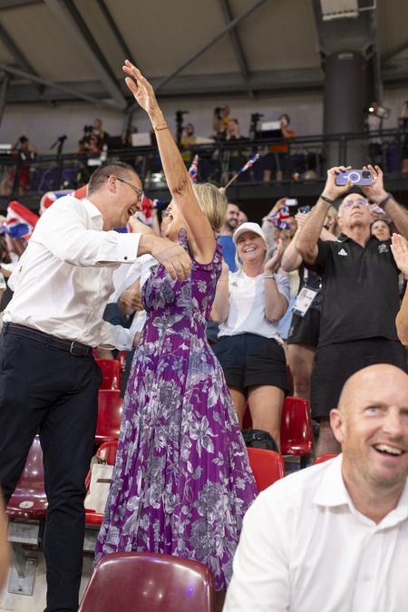 Księżna Sophie z Edynburga patrzy, jak Brytyjki wygrywają finał sprintu drużynowego kobiet w kolarstwie lekkoatletycznym podczas Igrzysk Olimpijskich 2024 w Paryżu (OG) na torze Vélodrome National w Saint-Quentin-en-Yvelines