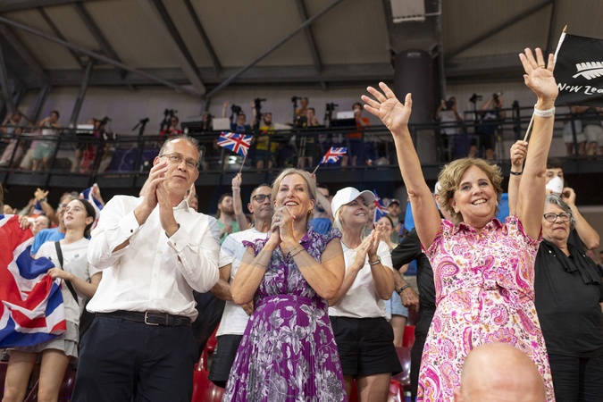 Księżna Sophie z Edynburga patrzy, jak Brytyjki wygrywają finał sprintu drużynowego kobiet w kolarstwie lekkoatletycznym podczas Igrzysk Olimpijskich 2024 w Paryżu (OG) na torze Vélodrome National w Saint-Quentin-en-Yvelines