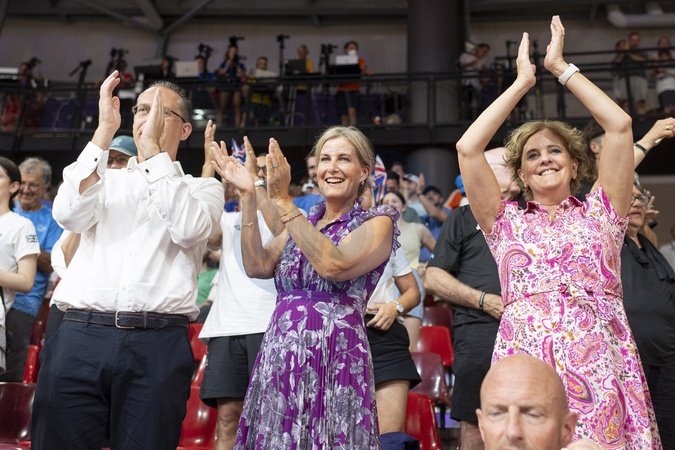 Księżna Sophie z Edynburga patrzy, jak Brytyjki wygrywają finał sprintu drużynowego kobiet w kolarstwie lekkoatletycznym podczas Igrzysk Olimpijskich 2024 w Paryżu (OG) na torze Vélodrome National w Saint-Quentin-en-Yvelines