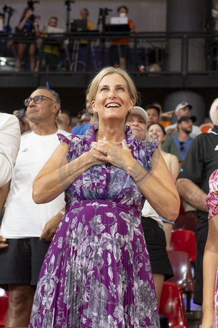 La duchesse Sophie d'Edimbourg assiste à la victoire des britanniques à la finale du sprint par équipes féminin sur piste en cyclisme lors des Jeux Olympiques (JO) de Paris 2024 au Vélodrome National à Saint-Quentin-en-Yvelines