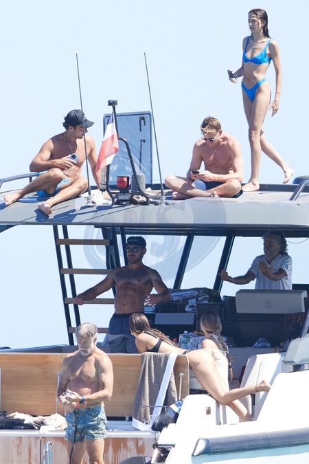 Exclusif - Gerard Butler, 54 ans, sa nouvelle compagne Penny Lane, 29 ans, et Zac Efron, 36 ans, en vacances sur un yacht dans le Golfe de Saint-Tropez, Cote d'Azur, FRance, le 8 juillet 2024. No Web pour la Belgique et la Suisse Excluvive - For Germany Call For Price - Gerard Butler, 54, his new girlfriend Penny Lane, 29, and Zac Efron, 36, on vacation on a yacht in the Gulf of Saint-Tropez, French Riviera, France, on July 8, 2024.