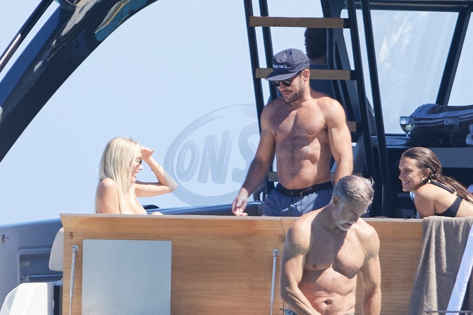 Exclusif - Gerard Butler, 54 ans, sa nouvelle compagne Penny Lane, 29 ans, et Zac Efron, 36 ans, en vacances sur un yacht dans le Golfe de Saint-Tropez, Cote d'Azur,