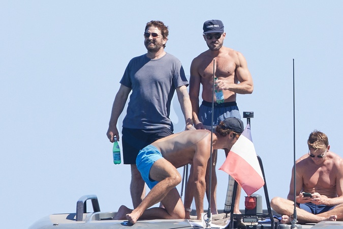 Exclusif - Gerard Butler, 54 ans, sa nouvelle compagne Penny Lane, 29 ans, et Zac Efron, 36 ans, en vacances sur un yacht dans le Golfe de Saint-Tropez, Cote d'Azur, FRance, le 8 juillet 2024. No Web pour la Belgique et la Suisse Excluvive - For Germany Call For Price - Gerard Butler, 54, his new girlfriend Penny Lane, 29, and Zac Efron, 36, on vacation on a yacht in the Gulf of Saint-Tropez, French Riviera, France, on July 8, 2024.