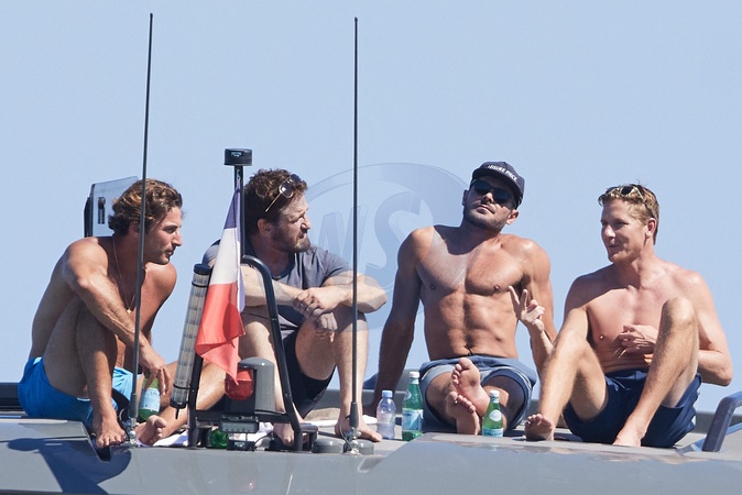 Exclusif - Gerard Butler, 54 ans, sa nouvelle compagne Penny Lane, 29 ans, et Zac Efron, 36 ans, en vacances sur un yacht dans le Golfe de Saint-Tropez, Cote d'Azur, FRance, le 8 juillet 2024. No Web pour la Belgique et la Suisse Excluvive - For Germany Call For Price - Gerard Butler, 54, his new girlfriend Penny Lane, 29, and Zac Efron, 36, on vacation on a yacht in the Gulf of Saint-Tropez, French Riviera, France, on July 8, 2024.