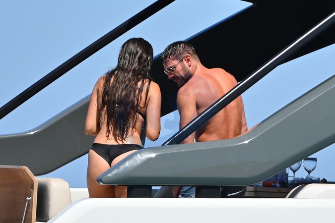 Exclusif - Gerard Butler, 54 ans, sa nouvelle compagne Penny Lane, 29 ans, et Zac Efron, 36 ans, en vacances sur un yacht dans le Golfe de Saint-Tropez, Cote d'Azur,