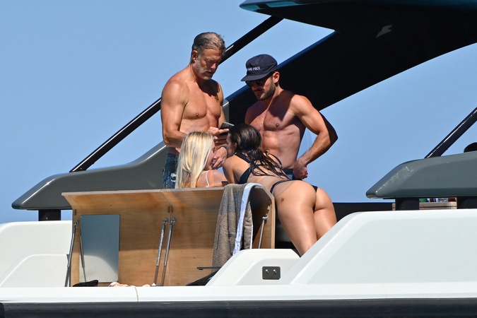Exclusif - Gerard Butler, 54 ans, sa nouvelle compagne Penny Lane, 29 ans, et Zac Efron, 36 ans, en vacances sur un yacht dans le Golfe de Saint-Tropez, Cote d'Azur, FRance, le 8 juillet 2024. No Web pour la Belgique et la Suisse Excluvive - For Germany Call For Price - Gerard Butler, 54, his new girlfriend Penny Lane, 29, and Zac Efron, 36, on vacation on a yacht in the Gulf of Saint-Tropez, French Riviera, France, on July 8, 2024.