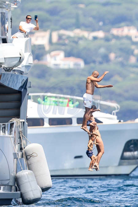 Exclusif - Prix Spécial - No Crédit - BI - No Web - L'ancien meneur français des Spurs de San AntonioTony Parker avec sa compagne Agathe Teyssier et ses enfants Liam et Josh en vacances sur son yacht Infinity Nine (à 9M€) dans le golfe de Saint-Tropez, Côte d'Azur, France, le 5 août 2024. Au programme: Saut dans la mer du ponton supérieur, scooters de mer, Seabobs, bouée tractée pour bateau, bronzage et câlins.... Exclusive - For Germany Call For Prize - No Credit - No Web - Former French leader for the San Antonio Spurs Tony Parker with his partner Agathe Teyssier and his children Liam and Josh on vacation on his yacht Infinity Nine (€9M) in the Gulf of Saint-Tropez, French Riviera, France, August 5, 2024. On the program: Jumping into the sea from the upper pontoon, sea scooters, Seabobs, towed buoy for boat, sunbathing and cuddles....