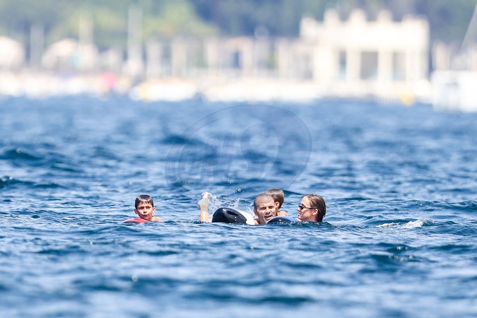 Exclusif - Prix Spécial - No Crédit - BI - No Web - L'ancien meneur français des Spurs de San AntonioTony Parker avec sa compagne Agathe Teyssier et ses enfants Liam et Josh en vacances sur son yacht Infinity Nine (à 9M€) dans le golfe de Saint-Tropez, Côte d'Azur, France, le 5 août 2024. Au programme: Saut dans la mer du ponton supérieur, scooters de mer, Seabobs, bouée tractée pour bateau, bronzage et câlins.... Exclusive - For Germany Call For Prize - No Credit - No Web - Former French leader for the San Antonio Spurs Tony Parker with his partner Agathe Teyssier and his children Liam and Josh on vacation on his yacht Infinity Nine (€9M) in the Gulf of Saint-Tropez, French Riviera, France, August 5, 2024. On the program: Jumping into the sea from the upper pontoon, sea scooters, Seabobs, towed buoy for boat, sunbathing and cuddles....