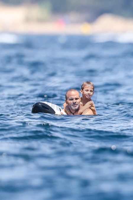 Exclusif - Prix Spécial - No Crédit - BI - No Web - L'ancien meneur français des Spurs de San AntonioTony Parker avec sa compagne Agathe Teyssier et ses enfants Liam et Josh en vacances sur son yacht Infinity Nine (à 9M€) dans le golfe de Saint-Tropez, Côte d'Azur, France, le 5 août 2024. Au programme: Saut dans la mer du ponton supérieur, scooters de mer, Seabobs, bouée tractée pour bateau, bronzage et câlins.... Exclusive - For Germany Call For Prize - No Credit - No Web - Former French leader for the San Antonio Spurs Tony Parker with his partner Agathe Teyssier and his children Liam and Josh on vacation on his yacht Infinity Nine (€9M) in the Gulf of Saint-Tropez, French Riviera, France, August 5, 2024. On the program: Jumping into the sea from the upper pontoon, sea scooters, Seabobs, towed buoy for boat, sunbathing and cuddles....