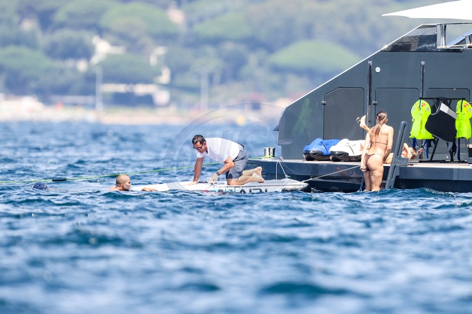 Exclusif - Prix Spécial - No Crédit - BI - No Web - L'ancien meneur français des Spurs de San AntonioTony Parker avec sa compagne Agathe Teyssier et ses enfants Liam et Josh en vacances sur son yacht Infinity Nine (à 9M€) dans le golfe de Saint-Tropez, Côte d'Azur, France, le 5 août 2024. Au programme: Saut dans la mer du ponton supérieur, scooters de mer, Seabobs, bouée tractée pour bateau, bronzage et câlins.... Exclusive - For Germany Call For Prize - No Credit - No Web - Former French leader for the San Antonio Spurs Tony Parker with his partner Agathe Teyssier and his children Liam and Josh on vacation on his yacht Infinity Nine (€9M) in the Gulf of Saint-Tropez, French Riviera, France, August 5, 2024. On the program: Jumping into the sea from the upper pontoon, sea scooters, Seabobs, towed buoy for boat, sunbathing and cuddles....