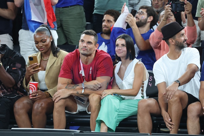 Florent Manaudou et sa compagne Lola Duménil - Les célébrités assistent à la victoire de l'équipe de France de basket face au Canada (82-73) lors des Jeux Olympiques de Paris2024, le 6 août 2024. © Jacovides-Perusseau / Bestimage Merci de flouter le visage des enfants avant parution Celebrities attend the victory of the French basketball team against Canada (82-73) during the Paris 2024 Olympic Games, on August 6, 2024.