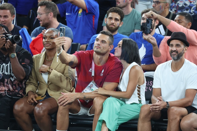 Florent Manaudou et sa compagne Lola Duménil - Les célébrités assistent à la victoire de l'équipe de France de basket face au Canada (82-73) lors des Jeux Olympiques de Paris2024, le 6 août 2024. © Jacovides-Perusseau / Bestimage Merci de flouter le visage des enfants avant parution Celebrities attend the victory of the French basketball team against Canada (82-73) during the Paris 2024 Olympic Games, on August 6, 2024.