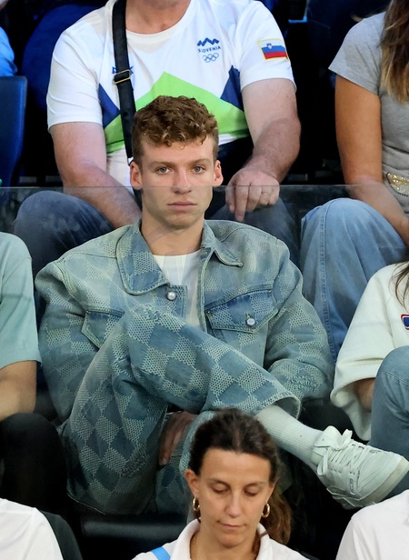 Léon Marchand - Les célébrités assistent à la victoire de l'équipe des USA de basket face au Brésil (122-87) lors des Jeux Olympiques de Paris2024, le 6 août 2024. © Jacovides-Perusseau / Bestimage Celebrities attend the victory of the US basketball team against Brésil (122-87) during the Paris 2024 Olympic Games, on August 6, 2024.