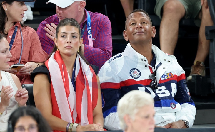 Alex Rodriguez et une amie - Les célébrités assistent à la victoire de l'équipe des USA de basket face au Brésil (122-87) lors des Jeux Olympiques de Paris2024, le 6 août 2024. © Jacovides-Perusseau / Bestimage Celebrities attend the victory of the US basketball team against Brésil (122-87) during the Paris 2024 Olympic Games, on August 6, 2024.