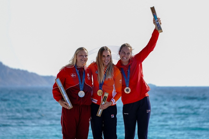 Anne-Marie RINDOM (Denmark), Marit BOUWMEESTER (Netherlands) and Line Flem HOEST (Norway) - Women's Dinghy medal race - Sailing, during the Olympic Games Paris 2024 at Marseille marina, France, on August 7, 2024. © Norbert Scanella/Panoramic/Bestimage