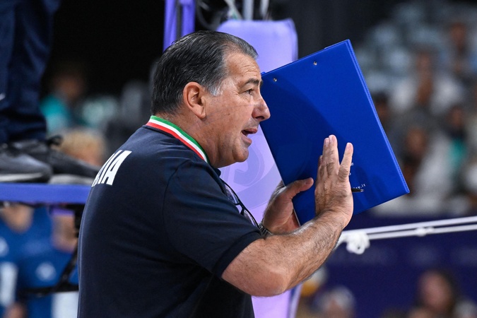 Volley-ball : Sans trembler, la France éteint l'Italie et rejoint la Pologne en finale lors des jeux olympiques Paris 2024 (JO 2024) le 7 août 2024. © Federico Pestellini / Panoramic / Bestimage Semi finals - De GIORGI Ferdinando ( coach Italy ) during the 2024 Olympics Games match between Italy and France at Arena Paris Sud on August 07, 2024 in Paris, France. -