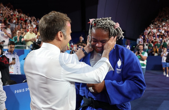 Exclusif - Prix Spécial - No Web - Emmanuel Macron console Romane Dicko en larmes - Emmanuel Macron assiste aux épreuves de judo lors des Jeux Olympiques de Paris2024 (JO) le 2 aout 2024. © Dominique Jacovides-Pierre Perusseau/Bestimage Excluive - For Germany call for Price - Emmanuel Macron attends the judo events during the Paris2024 Olympic Games (Olympics) on August 2, 2024. © Dominique Jacovides-Pierre Perusseau/Bestimage