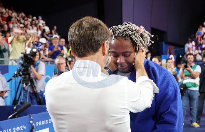 Exclusif - Prix Spécial - No Web - Emmanuel Macron console Romane Dicko en larmes - Emmanuel Macron assiste aux épreuves de judo lors des Jeux Olympiques de Paris2024 (JO) le 2 aout 2024. © Dominique Jacovides-Pierre Perusseau/Bestimage Excluive - For Germany call for Price - Emmanuel Macron attends the judo events during the Paris2024 Olympic Games (Olympics) on August 2, 2024. © Dominique Jacovides-Pierre Perusseau/Bestimage