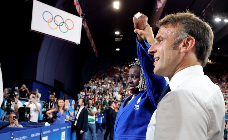 Exclusif - Prix Spécial - No Web - Emmanuel Macron console Romane Dicko en larmes - Emmanuel Macron assiste aux épreuves de judo lors des Jeux Olympiques de Paris2024 (JO) le 2 aout 2024. © Dominique Jacovides-Pierre Perusseau/Bestimage Excluive - For Germany call for Price - Emmanuel Macron attends the judo events during the Paris2024 Olympic Games (Olympics) on August 2, 2024. © Dominique Jacovides-Pierre Perusseau/Bestimage