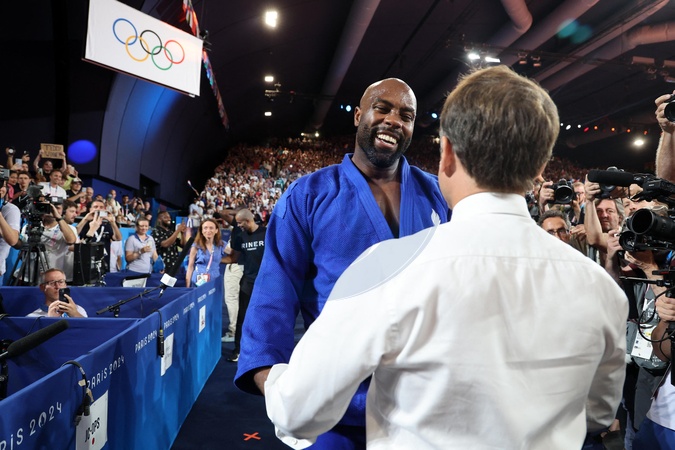 Exclusif - Prix Spécial - No Web - Emmanuel Macron et Teddy Riner - Emmanuel Macron assiste aux épreuves de judo lors des Jeux Olympiques de Paris2024 (JO) le 2 aout 2024. © Dominique Jacovides-Pierre Perusseau/Bestimage Excluive - For Germany call for Price - Emmanuel Macron attends the judo events during the Paris2024 Olympic Games (Olympics) on August 2, 2024. © Dominique Jacovides-Pierre Perusseau/Bestimage