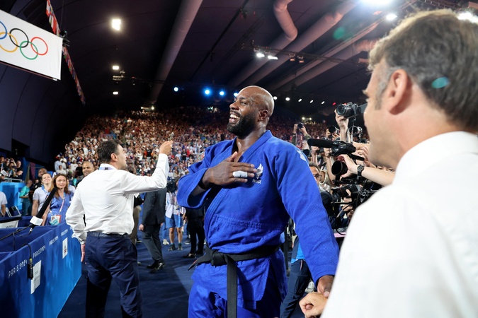 Exclusif - Prix Spécial - No Web - Emmanuel Macron et Teddy Riner - Emmanuel Macron assiste aux épreuves de judo lors des Jeux Olympiques de Paris2024 (JO) le 2 aout 2024. © Dominique Jacovides-Pierre Perusseau/Bestimage Excluive - For Germany call for Price - Emmanuel Macron attends the judo events during the Paris2024 Olympic Games (Olympics) on August 2, 2024. © Dominique Jacovides-Pierre Perusseau/Bestimage