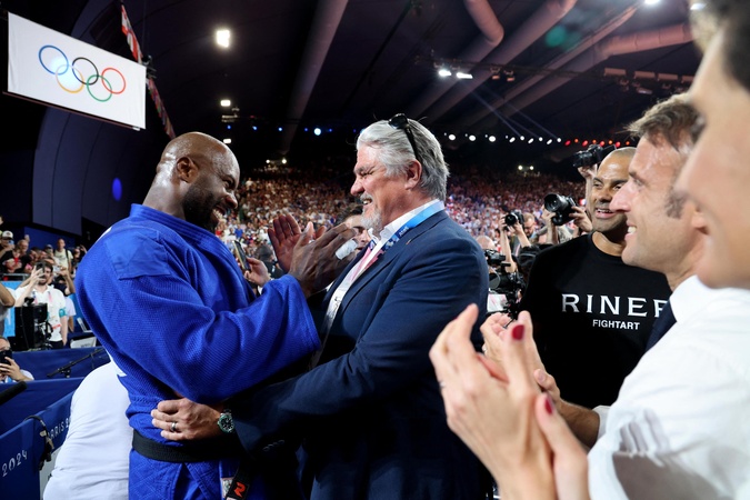 Exclusif - Prix Spécial - No Web - Teddy Riner, David Douillet et Emmanuel Macron - Emmanuel Macron assiste aux épreuves de judo lors des Jeux Olympiques de Paris2024 (JO) le 2 aout 2024. © Dominique Jacovides-Pierre Perusseau/Bestimage Excluive - For Germany call for Price - Emmanuel Macron attends the judo events during the Paris2024 Olympic Games (Olympics) on August 2, 2024. © Dominique Jacovides-Pierre Perusseau/Bestimage