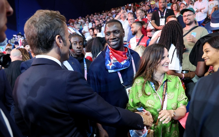 Exclusif - Prix Spécial - No Web - Emmanuel Macron avec Omar Sy et sa femme Hélène - Emmanuel Macron assiste aux épreuves de judo lors des Jeux Olympiques de Paris2024 (JO) le 2 aout 2024. © Dominique Jacovides-Pierre Perusseau/Bestimage Excluive - For Germany call for Price - Emmanuel Macron attends the judo events during the Paris2024 Olympic Games (Olympics) on August 2, 2024. © Dominique Jacovides-Pierre Perusseau/Bestimage